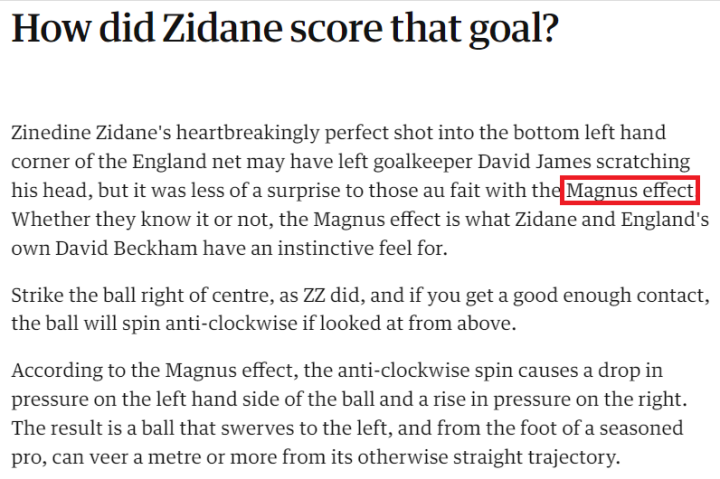 (图)当时英国《卫报》刊发专栏文章探究齐达内任意球的“马格纳斯效应”