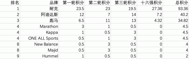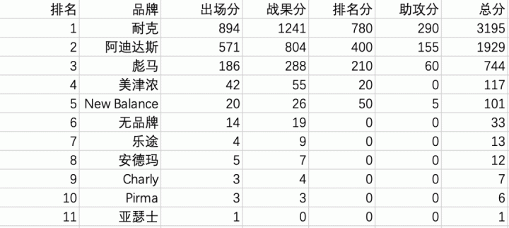 体育大生意统计了每位世界杯登场球员所穿球鞋的品牌,根据球员的表现计分,所得分数记在该品牌名下。把所有该品牌名下球员的积分相加,即为该品牌的总得分。按照总得分排名,得出球鞋榜榜单。