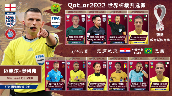 此外,从专职视频助理裁判员的去留上也能看出一些端倪。英格兰6:2伊朗最后时刻主动介入牵强点球的乌拉圭裁判莱奥丹·冈萨雷斯、比思那场小组赛的VAR肖恩·埃文斯以及连续两场比赛犯下致命性错误的卡塔尔VAR阿卜杜拉·马里均被提前“毕业”,而先后在阿根廷队第1轮和第3轮小组赛中介入牵强点球的荷兰人波尔·范布克尔却得以留任,且即将担任克罗地亚与巴西1/4决赛的VAR,但愿他不会给奥利弗继续“作妖”。