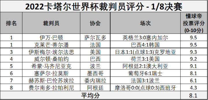 直到开场半个多小时过后,拉莫斯裁判组才逐渐找回状态,并在后续比赛中有着较为不错的表现,最终获评8.1分。除了上述三名裁判员,执法1/8决赛的其余五人均获得了9分以上的均分,在此就不一一点评了。