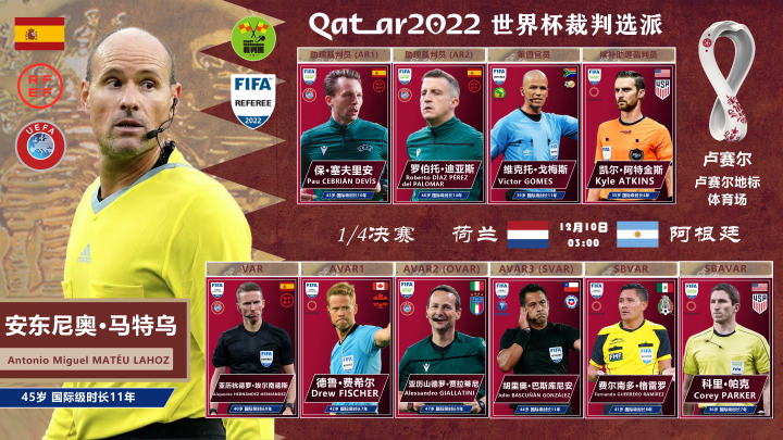 目前1/4决赛四场较量的裁判选派名单均已公布,大英名哨迈克尔·奥利弗将执法首场克罗地亚与巴西的对决,西班牙著名裁判“小公举”安东尼奥·马特乌将执法随后进行的荷兰与阿根廷的焦点大战,第二比赛日摩洛哥-葡萄牙以及“英法之战”则分别由阿根廷人特略和巴西人桑帕约担任主裁。