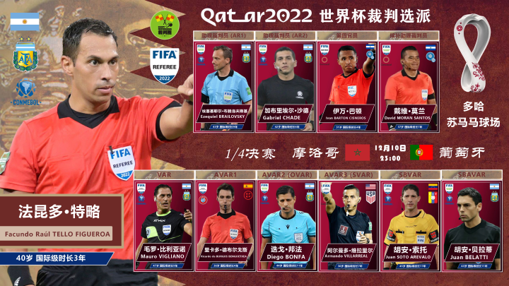 综上所述,目前可以预测两场半决赛大概率将由奥萨托和马齐尼亚克执法,这样一来最终半决赛和决赛共三场对决均将由欧足联裁判员担任主裁,无疑有些“不合常理”,故安排两名南美主裁执法1/4决赛。鉴于另一名阿根廷裁判拉帕利尼已在1/8决赛执法过摩洛哥队的比赛,那合适的人选便只剩下法昆多·特略了。