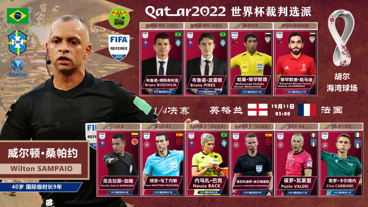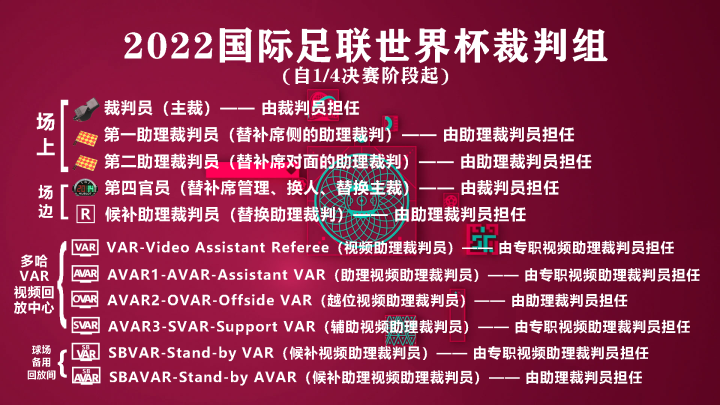细心的朋友可能会留意到,自1/4决赛起,世界杯每场比赛裁判团队的人数从10人变为了11人,正式实现了“裁判也能组队参赛”。相较于之前的配置,1/4决赛新增设的职位为“SBVAR”,由专职视频助理裁判员担任,将与“SBAVAR”一同坐在球场中的备用视频回放间内,一旦场上裁判组与多哈VAR回放中心失联,这二位将直接担任“临时VAR”与“临时AVAR”。