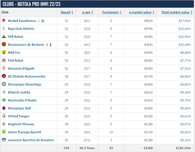 目前摩洛哥超级联赛中共有16支球队,总身价共计约1.26亿欧元,比本赛季中超联赛总身价低了约3800万欧元。其中身价最高的是卡萨布兰卡维达德,这支国内霸主球队曾经21次夺得摩洛哥顶级联赛冠军,此外还登顶过3次非洲足球冠军联赛。