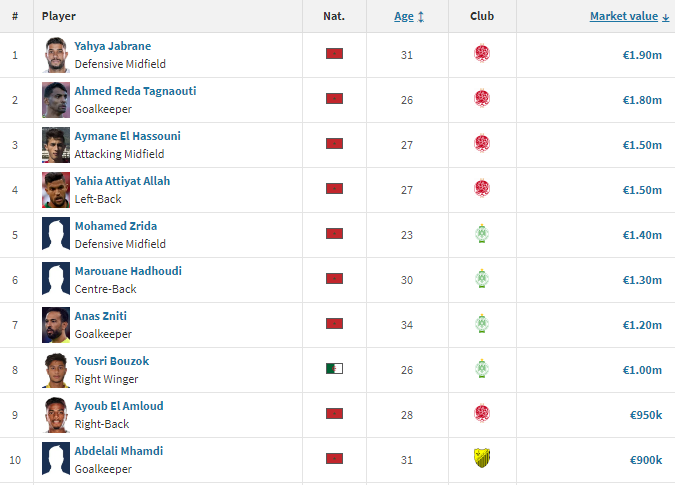 目前摩洛哥超级联赛中只有8名球员的身价超过100万欧元,其中身价最高的是卡萨布兰卡维达德的队长贾布拉内,这位现年31岁的本土中场在卡塔尔世界杯的大名单之中,但此前只有5分钟替补出场的时间。在卡塔尔世界杯的大名单中只有3名球员效力于本国联赛,他们全部来自卡萨布兰卡维达德。