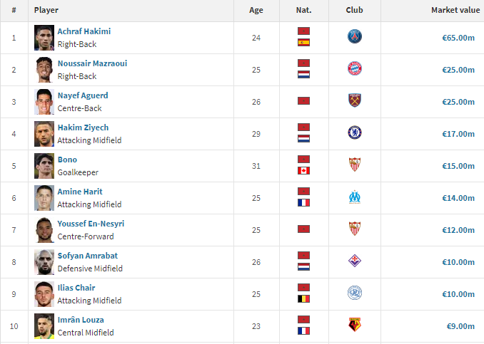 根据德国转会市场的数据,目前有9名摩洛哥籍球员的身价超过了1000万欧元,但只有3名球员的身价超过了2000万欧元。