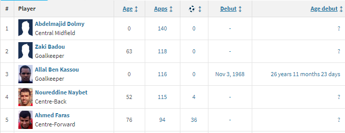 排名二三位的分别是门将扎基-巴度(118场,63岁,已退役)和门将卡索乌(116场,已故,1941-2013)