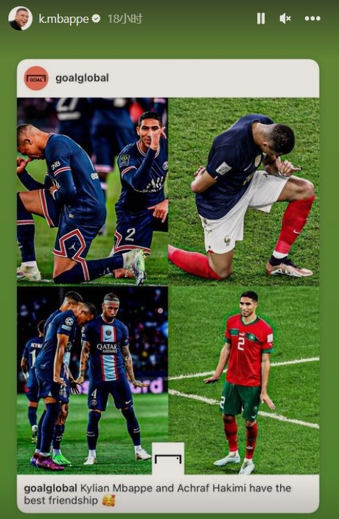 在摩洛哥历史性的晋级八强后,姆巴佩第一时间发社交媒体祝贺阿什拉夫,而且是连发两条,迫不及待程度可见一斑。