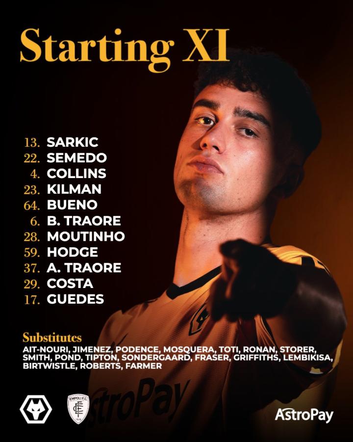 本场比赛首发:沙尔基奇、塞梅多、科林斯、基尔曼、布埃诺、布巴卡·特劳雷、穆蒂尼奥、霍奇、阿达马·特劳雷、格德斯、科斯塔。