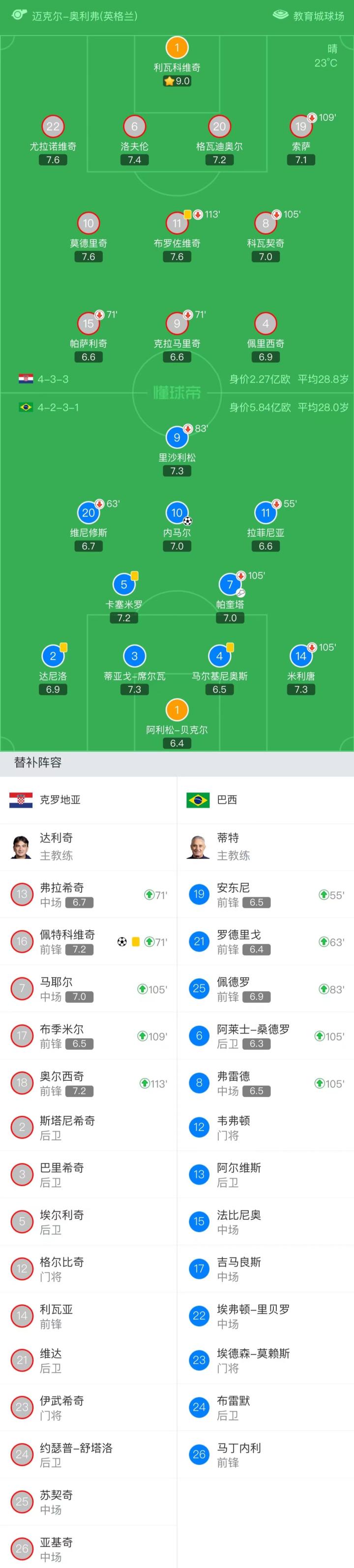 北京时间12月9日23:00,2022卡塔尔世界杯1/4决赛在教育城球场进行,克罗地亚对阵巴西,本场比赛主裁判是英格兰的迈克尔-奥利弗。上半场,维尼修斯远射被门将没收,内马尔兜射被门将没收,佩里西奇远射打偏。下半场,利瓦科维奇多次救险,内马尔小角度打门被挡出,90分钟战罢,克罗地亚0-0巴西。加时赛内马尔破门,这是内马尔为巴西国家队打进的第77球,追平了贝利成为巴西国家队射手王。佩特科维奇扳平比分,双方进入点球决战,罗德里戈和马尔基尼奥斯罚丢点球,最终,克罗地亚点球大战4-2淘汰巴西晋级4强。