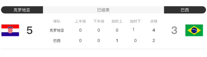 机会众多,但是巴西人把握不住。直到比赛进行到105分钟后(加时赛上半场进入补时),内马尔才为巴西队首开纪录。不过,12分钟后,佩特科维奇就为克罗地亚队追平比分。37岁的“老人”莫德里奇率领克罗地亚队顽强坚持到了最后,并且在点球大战里战胜了巴西人。