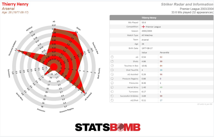 本文正是对亨利当赛季的数据回顾,数据来源StatsBomb。