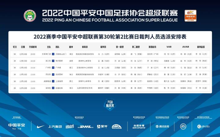 12月10日,2022赛季中超联赛第30轮迎来最后5场对决,具体对阵如下: