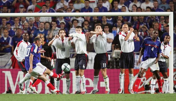 比赛第91分钟,法国获得中路禁区弧顶外任意球,齐达内主罚直接攻门,皮球直挂死角入网,法国1-1扳平英格兰。