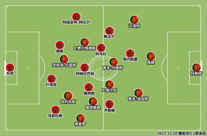 同1/8阶段阶段相比,费尔南多-桑托斯调整了拖后中场的人选,威廉-卡瓦略被鲁本-内维斯取代,这是要加快中场转移速度,以及增强外围远射能力的信号。从双后腰到三中场,葡萄牙后腰位置拦截和覆盖能力不足的问题始终没能得到根本解决,击败瑞士时的“铁腰”路线给了老帅错觉,他低估了摩洛哥中场的体格优势和人球结合能力,英超抢断王帕利尼亚枯坐板凳,为此役防守端的失势埋下了伏笔。