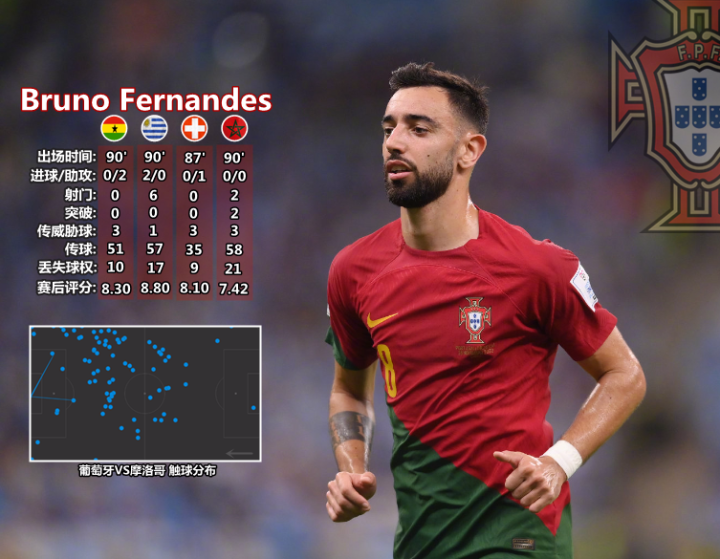 奥塔维奥将欧国联和世预赛期间的良好状态带到了世界杯赛场,变换角色后赢得首发位置。费尔南多-桑托斯希望三名“铁肺”中场与身后三名高大守将能够形成互补,这在对手进攻节奏较慢、中前场缺少破局能力(比如瑞士)时是可以实现的,面对高大且具备脚下摆脱能力的摩洛哥球员时就会显得有些吃力。或许是对帕利尼亚的传导球能力信心不足,费尔南多-桑托斯没有使用英超抢断王,这名身材高大、风格强硬且下脚精准的球员原本是对抗奥纳西、鲍法尔等人的理想人选。