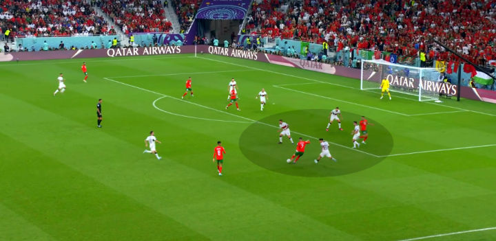 边后卫位置前移能够带来收益,也蕴藏着较大的风险。摩洛哥不断利用达洛特和格雷罗身后的空间发动反击,鲁本-内维斯在上抢延阻、横移覆盖和拼脚下球方面均处于下风,佩佩和鲁本-迪亚斯身前无险可守,终于被对手依靠传中球打破僵局。
