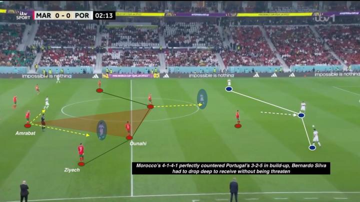 在与葡萄牙的比赛中,摩洛哥防守时的4-1-4-1体系再度大发神威。效力于佛罗伦萨的阿姆拉巴特在本场比赛中出任摩洛哥队的单后腰,左右边锋齐耶赫和鲍法尔会从进攻时的4-3-3的边锋站位回收到中场参与防守,站位如下图所示: