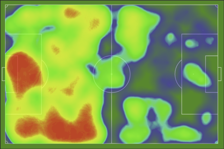 在全场的热点图中,我们可以看到:此役的摩洛哥基本上放弃了高位逼抢,选择屯兵中后场,用体格优势限制在葡萄牙与瑞士一役中机动性非常强的前中场组合之间的连线,逼迫葡萄牙不得不采用中长传的方式将炮弹输送到前线。