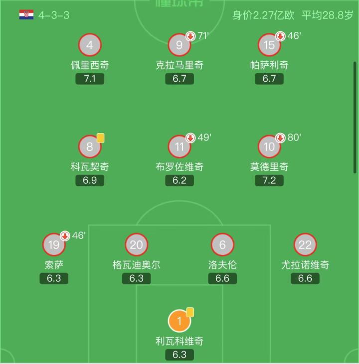 2球落后,达利奇其实已经没有其他选择,只能孤注一掷。换下上半场表现很差的索萨,换上弗拉西奇;又让奥尔西奇替下帕萨利奇,加强了左右两边的进攻。踢了几分钟达利奇感觉场面上没有任何用处,只好祭出了高中锋战术——佩特科维奇,但是换下的却是布罗佐维奇,准备放手一搏!此时,克罗地亚败局已定。其实阿根廷在高空防守上并不弱,奥塔门迪是本届世界杯空中争顶成功次数最多的,而克罗地亚前锋的身高不像荷兰那般占据绝对优势,阿根廷还是边路上的防守较为薄弱。