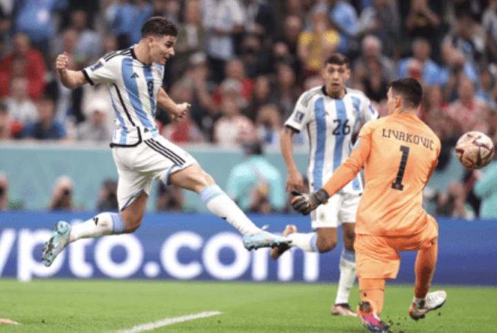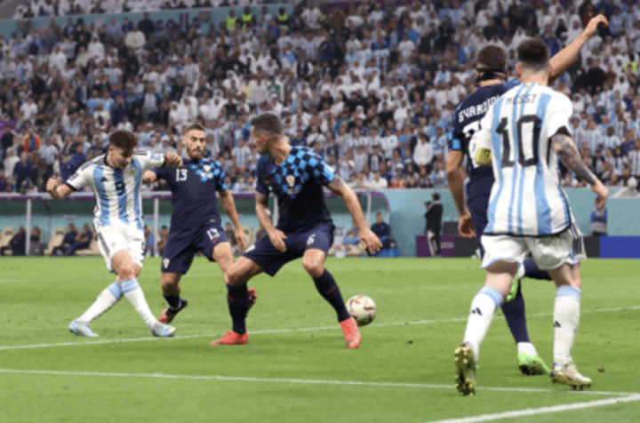 刚落后的克罗地亚还没反过劲儿,球队踢的较为混乱,阿根廷又在角球进攻中打出反击,梅西分球非常精妙,克罗地亚的中路混乱给阿尔瓦雷斯一条龙破门的机会。这是小蜘蛛在反击中强过劳塔罗的点——跑动能力和突破能力。