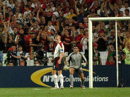 2004年欧洲杯和2006年世界杯的1/4决赛,英格兰与葡萄牙的两次对决都战至了点球大战,但英格兰都没能迈过鬼门关。其中贝克汉姆在2004年上演了踢飞点球的一幕,小贝的回眸成为了其职业生涯的经典瞬间。