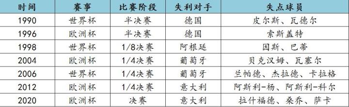 1990年世界杯是英格兰在大赛中点球大战梦魇的开始,他们在该届世界杯半决赛中与德国战至点球大战。