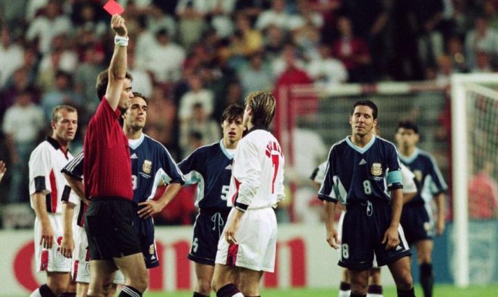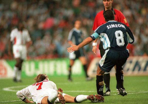 1998年世界杯1/8决赛中,英格兰遭遇阿根廷,在上半场助攻欧文首开记录的贝克汉姆在被放倒后用小腿报复性地触碰到了西蒙尼,后者的应声倒地让小贝直红下场。