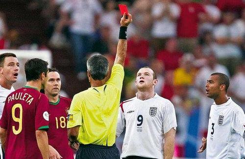 英格兰在2006年世界杯1/4决赛中再次同时遭遇了离奇红牌和点球失利的怪圈,鲁尼在下半场62分钟的疑似踩踏让其被罚下场。