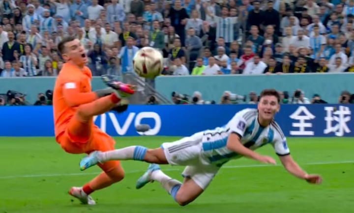 三个进球中第一个是阿尔瓦雷斯创造的点球,由梅西罚进;后两个则都是由他本人打进。阿根廷9号队员在半决赛的表现,超越了同场的队友梅西和对手阵中的莫德里奇两位巨星。