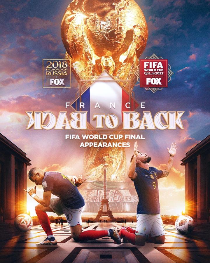 【法国成背靠背进世界杯决赛第五队】 世界杯历史上只有五支国家队可以背靠背打进世界杯决赛,其中只有两支做到过成功卫冕 1.意大利 ——1934&1938冠军 2.巴西——1958&1962冠军、1994冠军&1998亚军&2002冠军 3.荷兰——1974&1978亚军 4.阿根廷——1986冠军&1990亚军 5.法国——2018冠军&2022决赛 周日的决赛也将是双方同时争夺队史第三冠,到底会是“三星法国”还是“三星阿根廷”,让我们周末拭目以待! 世界杯冠军榜如下 1.巴西(1958、1962、1970、1994、2002) 2.德国(1954、1974、1990、2014) 3.意大利(1934、1938、1982、2006) 4.阿根廷(1978、1986) 5.法国(1998、2018) 6.乌拉圭(1930、1950) 7.英格兰(1966) 8.西班牙(2010)