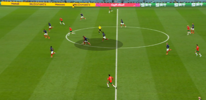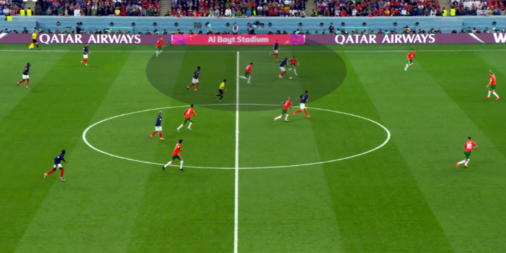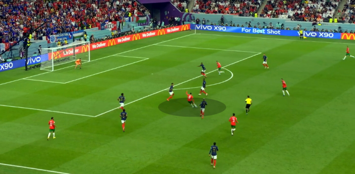 从4-3-3/4-5-1到5-4-1,雷格拉吉的变阵从表面上来看是加强了防守,但随着中场和卫线人员对比发生改变,摩洛哥的防守模式也要做出调整。当特奥-埃尔南德斯和奥斯曼-登贝莱拉边持球时,阿什拉夫和马兹拉维的移动受到了限制,阿姆拉巴特和欧纳希需要覆盖的面积变大,两名球员很难离开防守位置去上抢持球人,只能由边中卫的前顶来限制法国的接球人,(451体系)原有的外围拦截效应和防守层次感丢失,压力汇聚到了中卫身上。