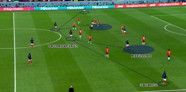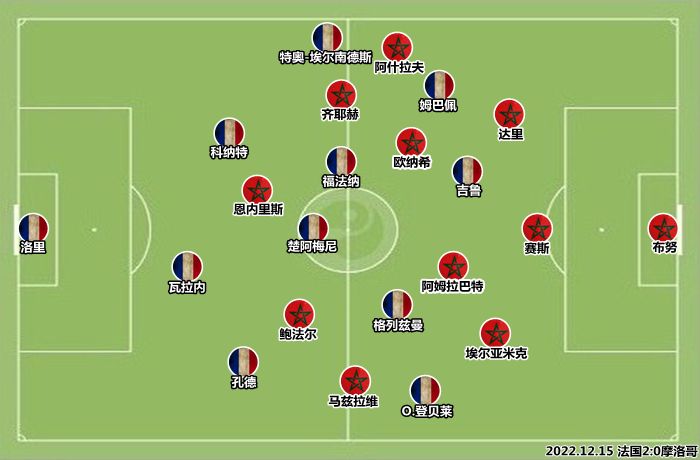 (图)从三中场变双后腰,摩洛哥中场控制力下降。法国依靠福法纳等人的上抢来争夺主动权,断球后直接冲击摩洛哥中卫。