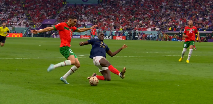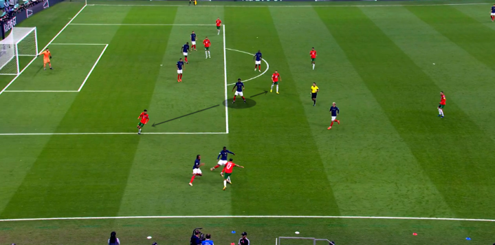 两队的主力班底都受到了不同程度的削弱,替补阵容同样达到了某种“均势”。法国的中锋位置深度不足,摩洛哥在切迪拉停赛后只能依靠阿布哈拉勒等人,这意味着比赛末段的博弈格局会变得混沌不堪,作为实力较强的一方应该争取尽早取得优势。开场阶段,法国有意让出球权,防守阵地却比较靠前,特奥-埃尔南德斯、科纳特和福法纳一侧依靠强势的前顶向对手施压,限制摩洛哥中场的拿球,切断齐耶赫和阿什拉夫的向前路径。
