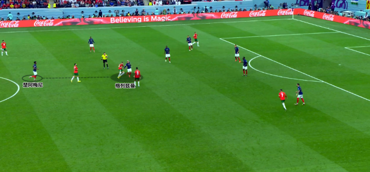 摩洛哥球员需要时间来适应这种变化,经验丰富的法国攻击手抓住机会打出“时间差”,格列兹曼依靠灵动的球路制造杀机。国际足联2022年卡塔尔世界杯技术研究小组成员、意大利名帅扎切罗尼在赛前指出:“法国的进攻威胁始于格列兹曼的调度。”从比赛的进程来看,雷格拉吉要求球员限制格列兹曼在中场的拿球,尤其是在其背身时要坚决包夹、寻找抢断机会,对其无球进攻的威胁性预估不足。