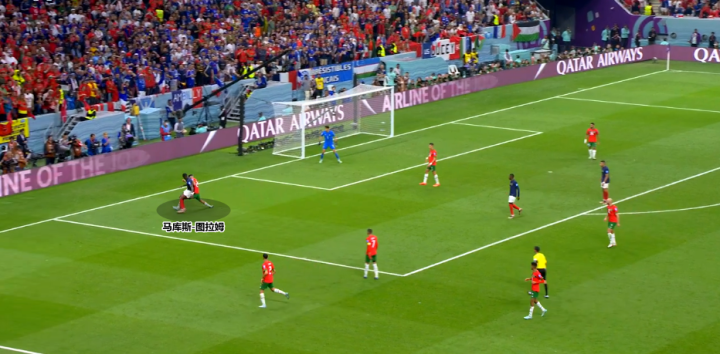 过去几场比赛,蓝衣防线已经暴露出不少问题:中前场逼抢和压迫能力一般,落入后场时只有8名球员参与深度防御;特奥-埃尔南德斯的防守动作比较冒失,楚阿梅尼一旦无法贴身就会威力大减,奥斯曼-登贝莱退守后场只是为了保持人数,左前卫在往返奔驰中消耗过大,格列兹曼在后腰位置上还没有受到过强有力的冲击……比分落后,摩洛哥变阵433,依靠细腻的两翼配合展开反攻,逐一打击法国后防的短板。
