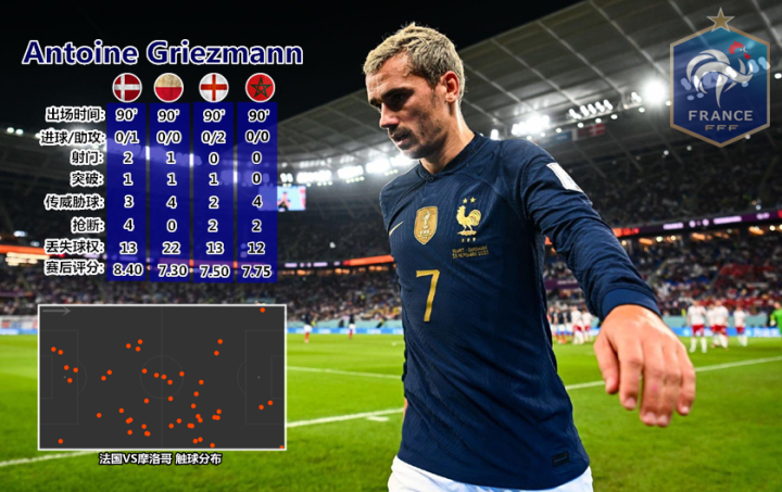 减少一名中场,增加一名边锋,德尚的变阵让法国在前场收获颇丰,昔日引以为傲的防守却有松动的迹象。姆巴佩从(2018)右前卫变身为左边锋,获得了无须深度回防的特权;从吉鲁在对阵英格兰时的表现可知,这名高中锋在防守时只能偶尔“爆发”,无法持续输出;加之后腰组合由博格巴&坎特换成了楚阿梅尼&格列兹曼,法国的防守人数和防守质量都无法与四年前相比,面对锋无力的摩洛哥时也是倍感挣扎。