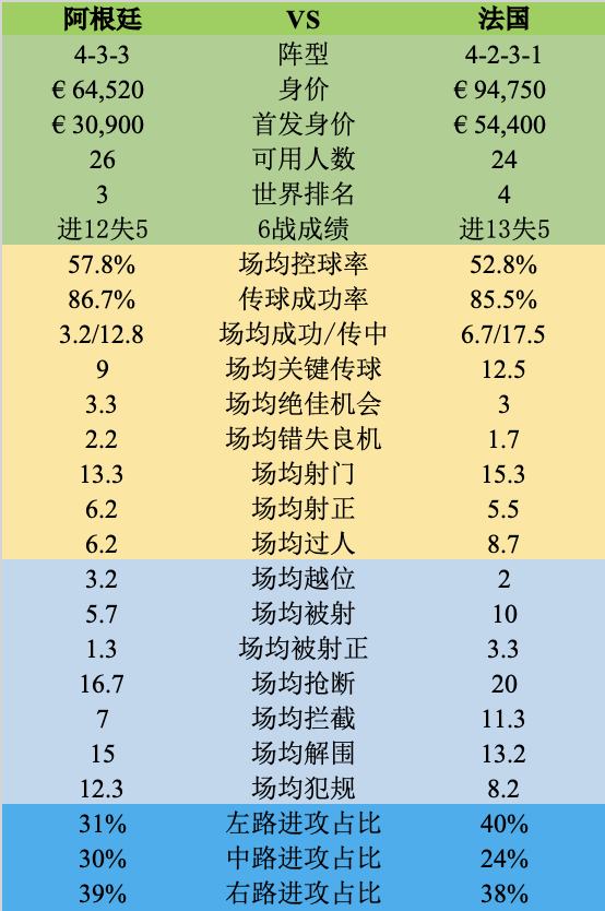 阿根廷的场均控球率为58%,传球成功率87%,基本在大多数比赛中掌握着主动,在与克罗地亚的比赛中踢的是防守反击,赢地非常完美。法国场均控球率为53%,传球成功率86%,在与弱队比赛则掌握主动,踢英格兰、摩洛哥则踢防守反击,对阿根廷,法国肯定会让出控球权,打反击战术。