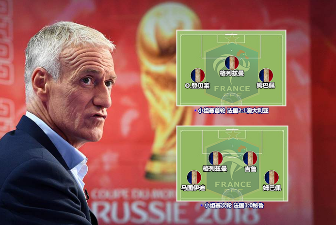 然而,天赋满满的法国队在小组赛中的表现与人们的预期相距甚远,他们在攻防两端的表现都缺乏整体性。西迪贝和本杰明-门迪相继受伤,历时半年打造的无锋阵首战搁浅,德尚只能被迫启用由四名中卫托底的中锋阵,两战收获三粒进球,提前完成出线任务。先是在与冰岛的较量中丢掉2分,后又因变阵失败遭到克罗地亚血洗,阿根廷末轮与尼日利亚苦战后才得以从小组中突围。德尚在小组收官战中使用了多达9名替补,这为法国在下半场的逆转埋下了伏笔。