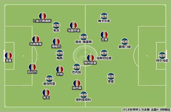首战冰岛时使用稳健型4231,用三中卫/五后卫应付克罗地亚,收官战对阵尼日利亚摆出不对称433阵型,桑保利无视麾下主力与替补之间实力差距较大的客观事实,其执意变阵和轮换加剧了阿根廷战术体系的动荡。面对实力强大的法国,桑保利采取了较为稳健的布局,恩佐-佩雷斯配合马斯切拉诺完成中场拦截任务,巴内加与迪马利亚、塔利亚菲科组成左路通道,梅西居中扮演“伪九”。