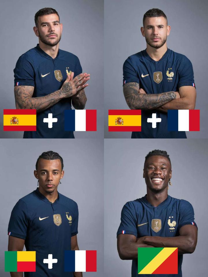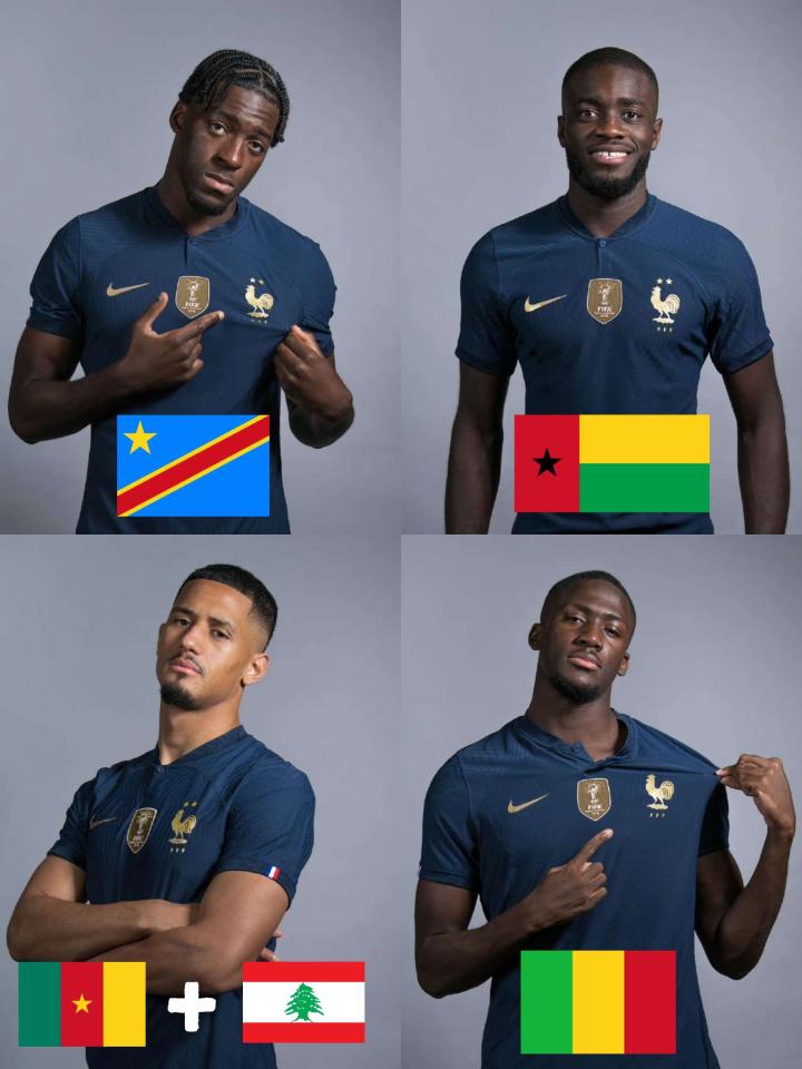 法国26名球员血统一览,仅3人为纯种法兰西血统 德尚/法国 门将: 洛里/西班牙+法国 阿雷奥拉/菲律宾 曼丹达/民主刚果 后卫: 卢卡斯·埃尔南德斯/西班牙+法国 特奥·埃尔南德斯/西班牙+法国 瓦拉内/马提尼克 孔德/贝宁+法国 萨利巴/喀麦隆+黎巴嫩 迪萨西/民主刚果 于帕梅卡诺/几内亚比绍 科纳特/马里 帕瓦尔/法国 中场: 楚阿梅尼/喀麦隆 卡马文加/刚果 贡多齐/摩洛哥+法国 优素福·福法纳/马里 韦勒图/挪威+法国 拉比奥/法国 前锋: 姆巴佩/喀麦隆+阿尔及利亚 本泽马/阿尔及利亚 马库斯·图拉姆/瓜德罗普 格列兹曼/葡萄牙+法 科曼 瓜德罗普 登贝莱/马里+毛里塔尼亚 吉鲁/意大利+法国 科洛·穆阿尼/民主刚果