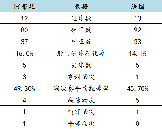 防守表现:双方的防守表现在丢球数上完全一样,但阿根廷在本届世界杯中贡献了3场零封,而法国队仅在半决赛中贡献了零封表现。值得一提的是,法国队在本届世界杯中暂时还没有平局出现。