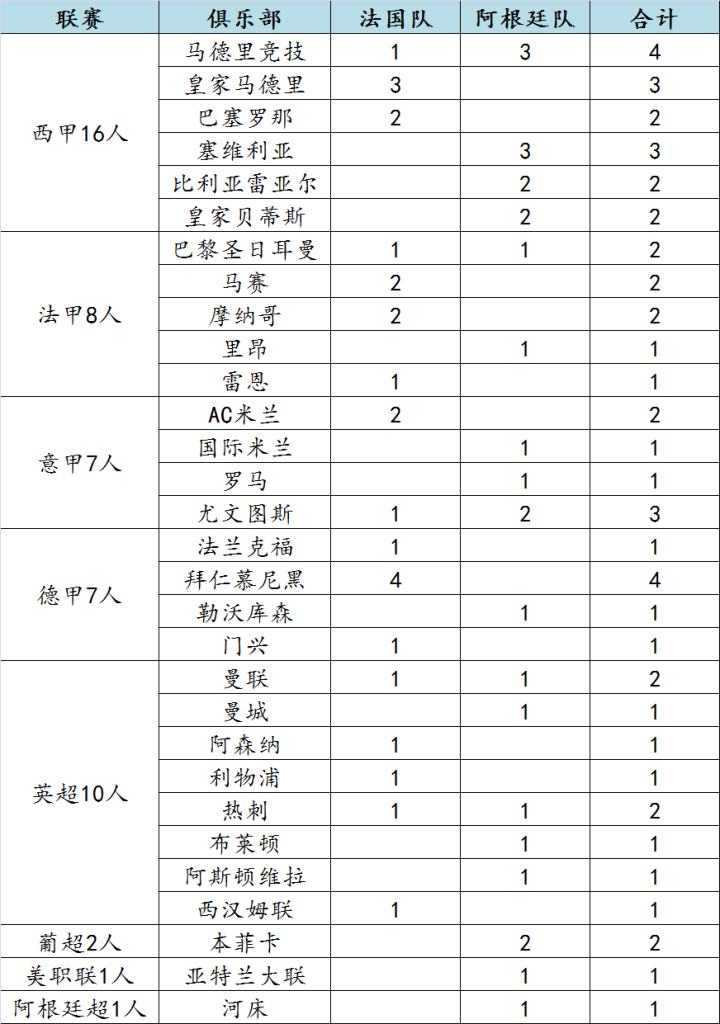阿根廷队和法国队的共计52名世界杯参赛球员分别来自30家俱乐部,其中48名球员效力于五大联赛俱乐部,占到了92.3%。来自马竞和拜仁的球员最多,各有4名。决赛名单中共计有16名球员来自西甲联赛,多于英超的10名,西甲成为了世界杯决赛大名单的最大赢家。