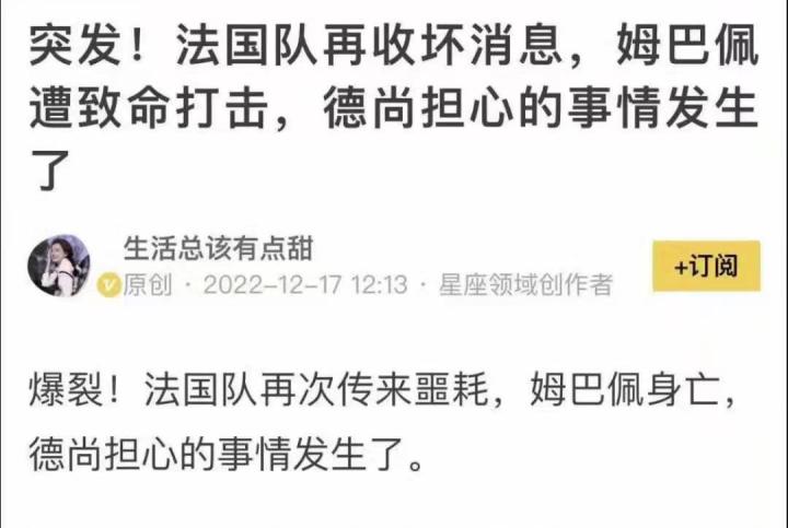 妖言惑众!昨日部分媒体胡乱报道,说姆巴佩“身亡了...北伦敦小酒馆 @懂球帝2022-12-18 12:59妖言惑众!昨日部分媒体胡乱报道,说姆巴佩“身亡了”,还说德尚最担心的事发生了,搞得好像德尚提前知道似的,让人笑掉大牙! 后图是footballtand拍摄的姆巴佩最新训练照片,于一个小时前上传的。 备战决赛的姆巴佩精神抖擞,身体看上去好好的!展开更多