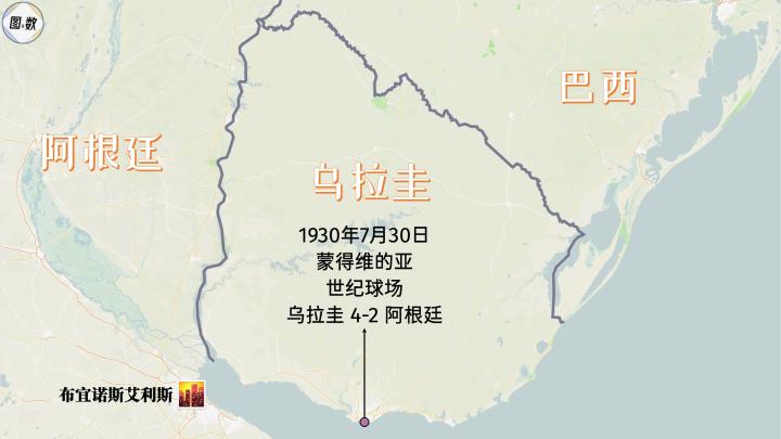 乌拉圭是第一个举办世界杯的国家,但需要注意的是,乌拉圭只是简称,他们的国名全称是乌拉圭东岸共和国(República Oriental del Uruguay),因为其地处乌拉圭河与拉普拉塔河的东岸。