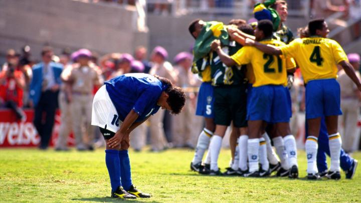 而这也是首次在常规时间和加时赛阶段都没有取得进球的决赛,最终是巴西通过点球大战赢下奖杯,而身穿蓝色球衣的巴乔则留下了无尽的遗憾。