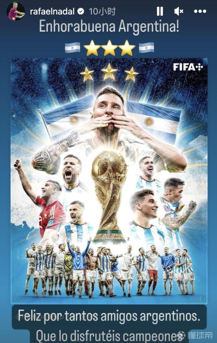 阿根廷获得世界杯冠军,网坛名将纳达尔在社交媒体上祝贺阿根廷队。