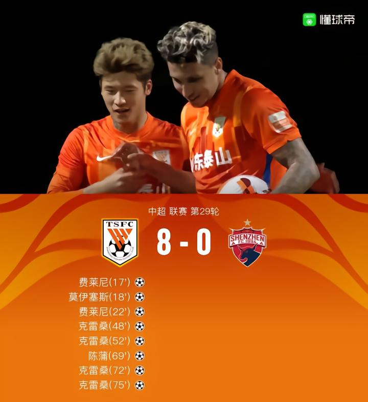 第75分钟,陈浦送出助攻,克雷桑推射空门上演大四喜,山东8-0深圳!
