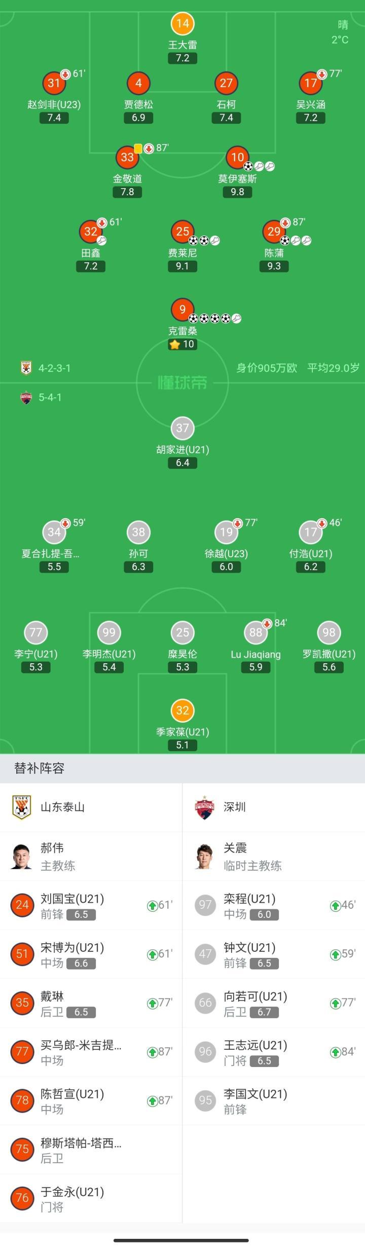 山东首发:14-王大雷、17-吴兴涵(77′35-戴琳)、4-贾德松、27-石柯、31-赵剑非(U23)(62′51-宋博为(U23))、33-金敬道(88′78-陈哲宣(U23))、10-莫伊塞斯、25-费莱尼、29-陈蒲(87′77-买乌郎(U23))、32-田鑫(62′24-刘国宝(U23))、9-克雷桑