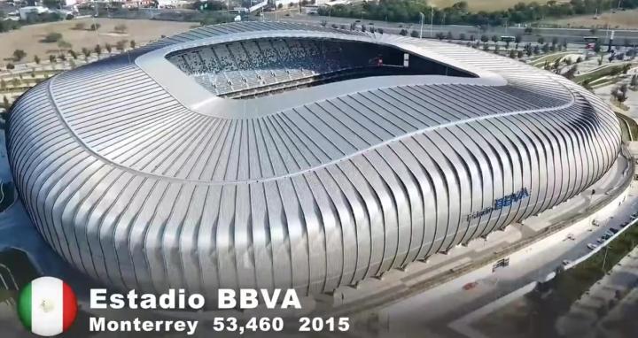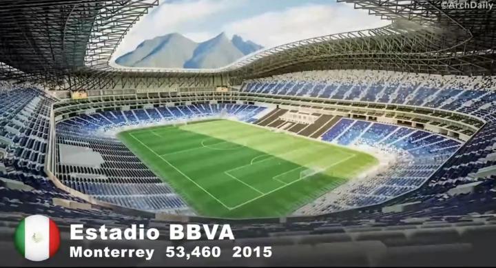蒙特雷·西班牙对外银行体育场(Estadio BBVA),启用于2015年8月2日,可容纳观众5.3万多,现为墨西哥足球超级联赛球队蒙特雷的主场。设计灵感来源于当地酿酒和钢铁制造的历史,该体育场的自支撑三脚架结构打造出了雕塑般的形式,两侧是包覆铝材的轧制钢桁架,向当地的钢铁厂致敬。55米的巨大结构悬臂式屋顶,则保证了体育场内最大的舒适度和遮阳度。